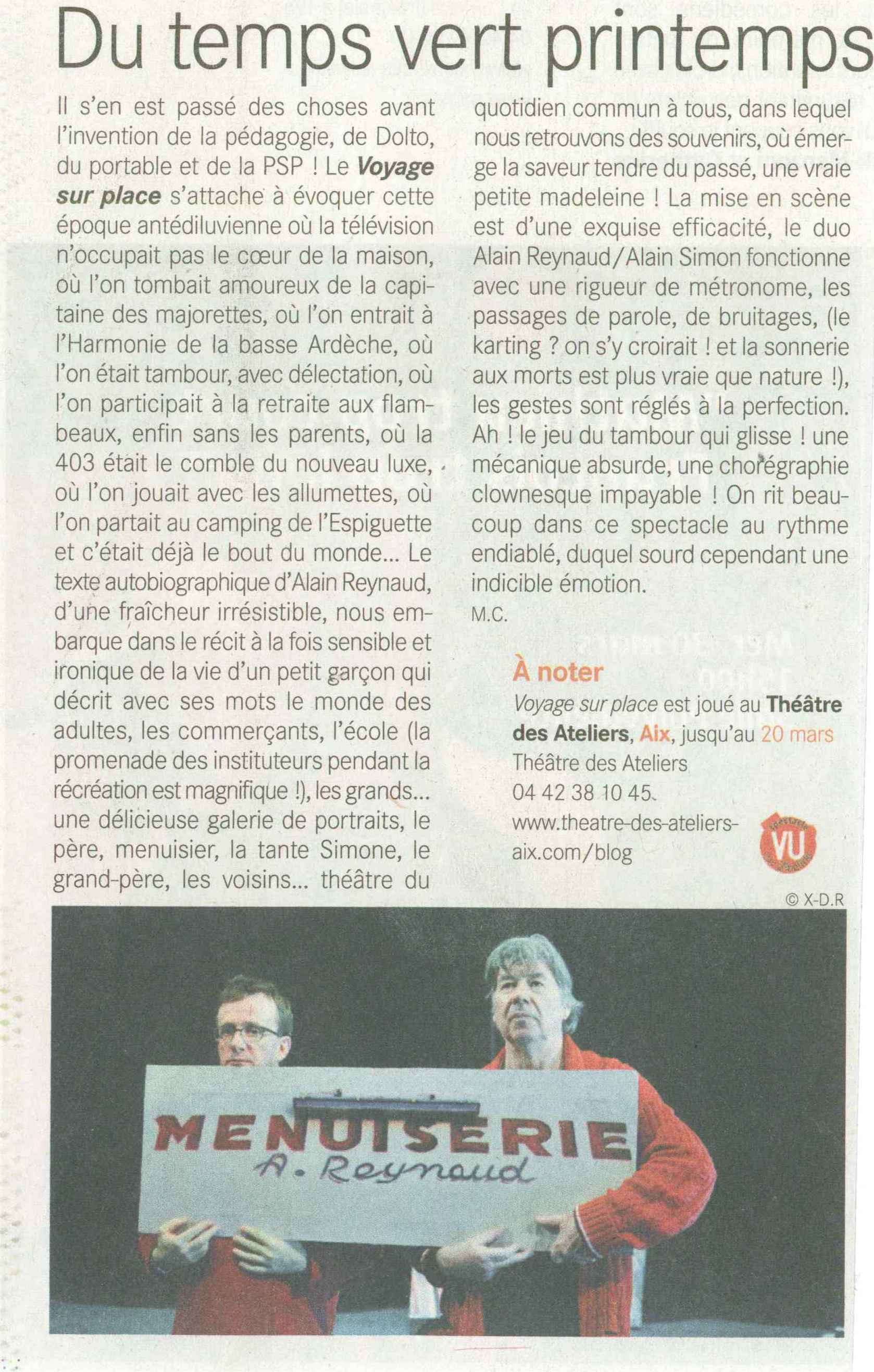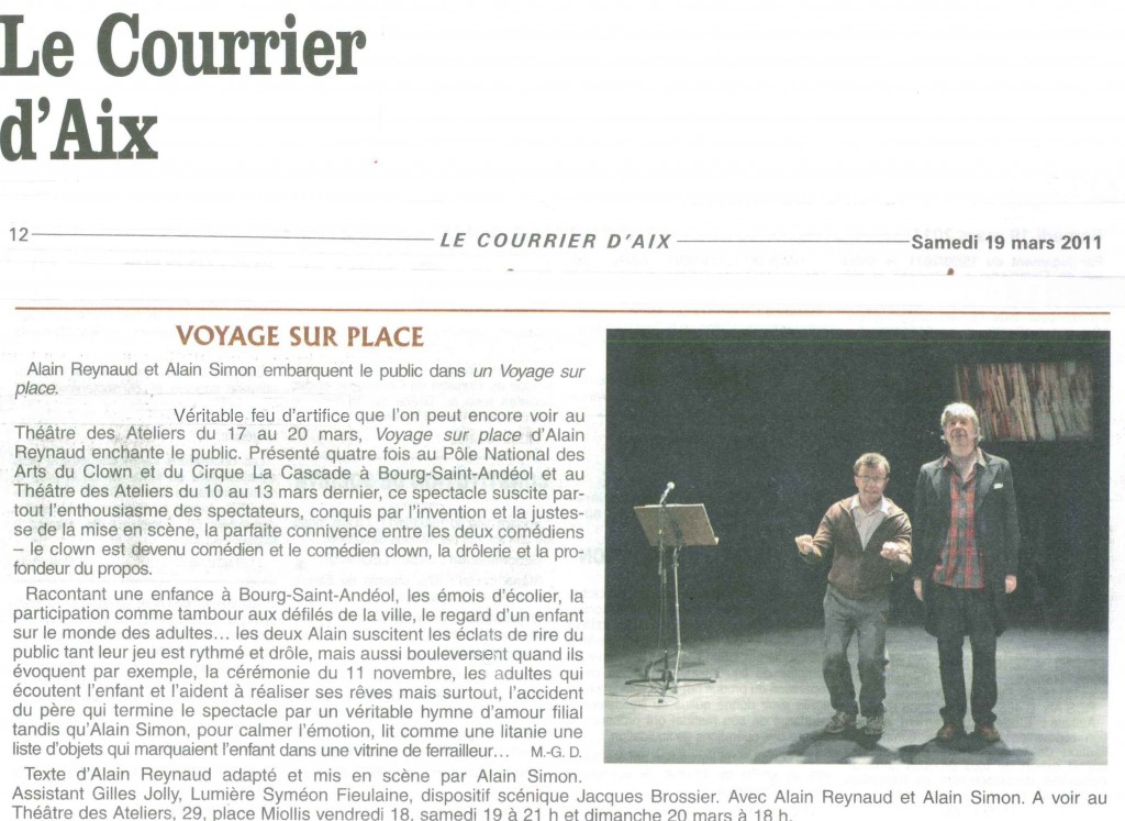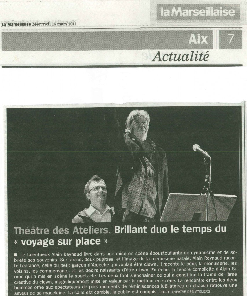 Alain Reynaud, clown et directeur artistique du nouveau festival d’Alba-la-Romaine (07) entre autres, et Alain Simon, acteur et metteur en scène, directeur artistique du Théâtre des Ateliers d’Aix-en-Provence, ont, samedi soir, fait une prestation exceptionnelle tenant la scène durant deux heures. Ils ont fait revivre avec humour et tendresse l’enfance d’Alain le clown qui fut fasciné par son père dont la figure haute en couleur et en humanité revient tout au long du récit. On retrouve sa famille, ses voisins, son école, son quartier. Avec son compère Alain Simon, ils parlent d’une époque pleine de petits artisans, de fêtes de villages, de rêves. Cette histoire, construite à partir d’improvisations, n’a rien de nostalgique. Le public qui avait rempli les gradins sous le chapiteau ne s’y est pas trompé et a passé une soirée où les rires des enfants mais aussi des grands ont montré aux comédiens que « Voyage sur place » a été apprécié de tous. « Voyage sur place » nous plonge dans un univers dans lequel chacun peut se reconnaître.