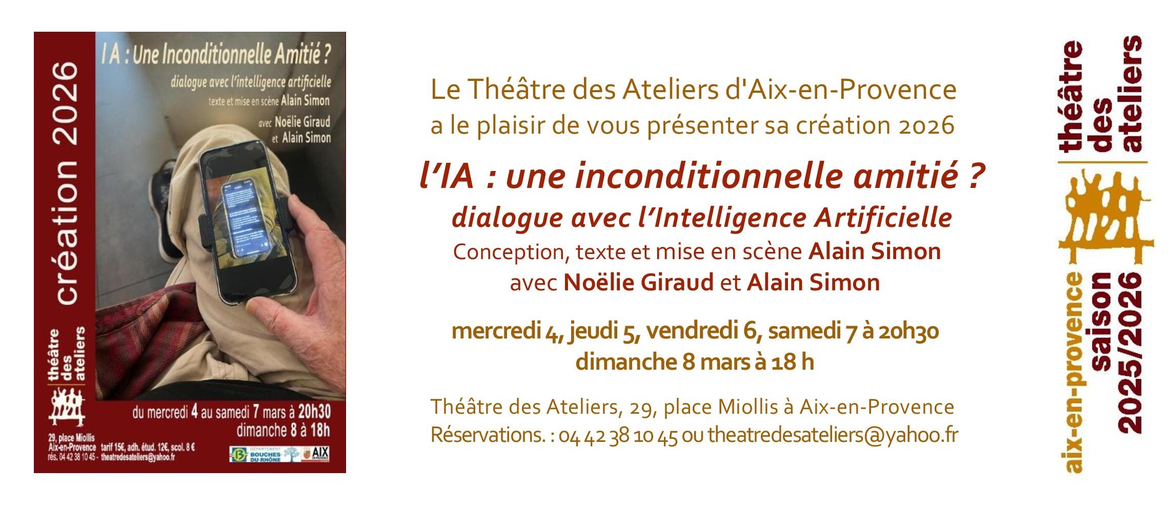 Création 2026 du Théâtre des Ateliers L’IA : une Inconditionnelle Amitié, dialogue avec l’Intelligence Artificielle est la cinquante et unième création du Théâtre des Ateliers depuis 1981 (hors créations Jeune Public et Compagnie d’entraînement) !