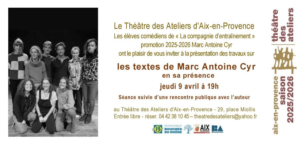 Ce jeudi 9 avril nous sommes très heureux d’accueillir  l’auteur  franco-québécois Marc Antoine Cyr, associé à la promotion 2025-2026 de “La compagnie d’entraînement’, et qui vient assister à présentation des travaux de recherche sur ses textes par les élèves comédiens. Ces travaux consistent à explorer, à partir de textes de l’auteur associé à leur promotion,  différents partis pris propres à mettre en valeur plusieurs aspects de son univers. Après cette rencontre avec l’auteur, les élèves travailleront avec lui au cours d’un séminaire de 3 jours, à l’issue duquel ils choisiront la pièce qu’ils créeront en juin pour 7 représentations.