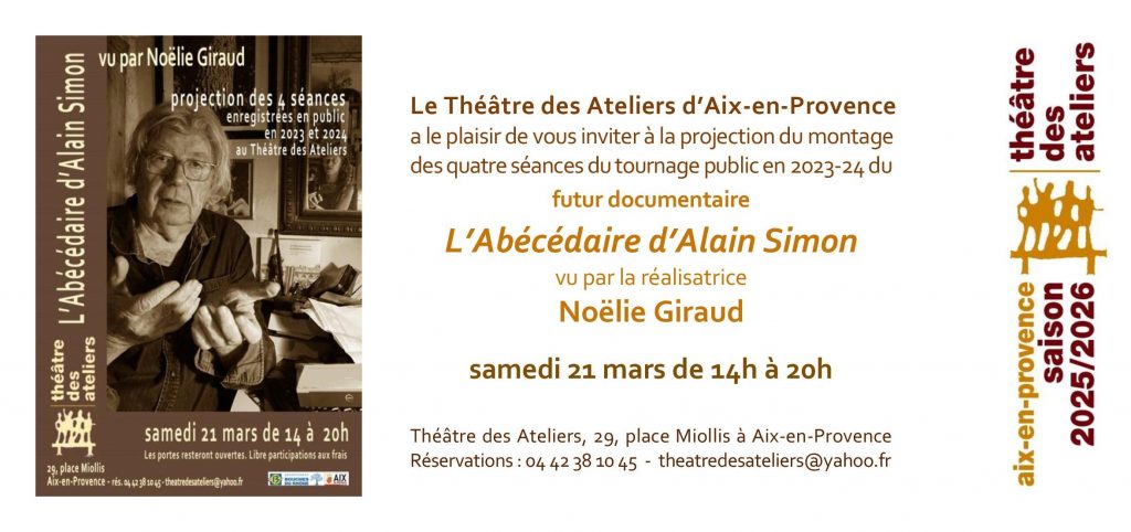 Quand Noëlie m’a proposé ce projet de biographie filmée sous la forme d’un abécédaire, je lui ai demandé si les tournages de cette interview pouvaient être publics, ce qui a donné lieu à quatre rendez-vous avec les spectateurs au théâtre. Le tournage est devenu ainsi un spectacle et la présence du public à profondément déterminé mes réponses  et leur ton. Je suis curieux des réaction des spectateurs à cette projection de l’intégrale et d’y évaluer la place de mon parcours théâtral. Alain Simon