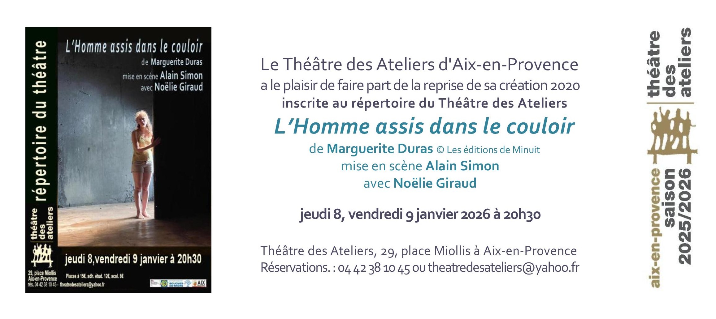 Le Théâtre des Ateliers présente depuis 42 ans au moins une création par an. Beaucoup d’entre elles sont singulières, originales. Nous avons voulu en choisir quelques-unes pour en faire le répertoire du Théâtre des Ateliers. Cette année, L’Homme assis dans le couloir de Marguerite Duras, œuvre peu montée et qui a été un des événements de la compagnie. Nous tenons à ce que ce répertoire soit diffusé le plus largement possible, notamment auprès de publics qui ne sont pas habitués et familiers des théâtres. Nous en proposons donc en ce début d’année une version scénique plus adaptée à des lieux aussi différents que des petites salles, des médiathèques, des lieux publics non destinés au théâtre, voire des appartements. Car si le souci du Théâtre des Ateliers a toujours été d’être exigeant sur la qualité des œuvres montées, il est en même temps désireux de les partager avec le plus grand nombre.